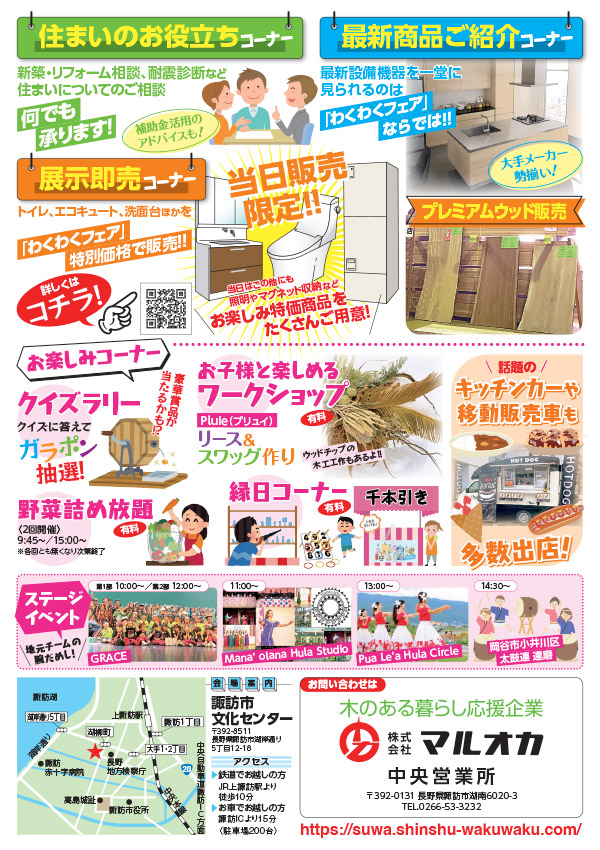 住まいのお役立ちコーナー、最新商品ご紹介コーナー、展示即売コーナー、プレミアムウッド販売、お楽しみコーナー、ステージイベント など